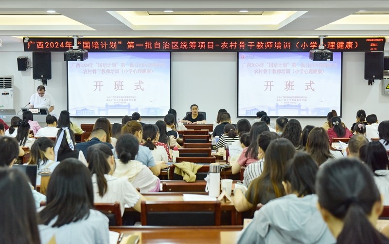 本次培训班由广西壮族自治区教育厅主办,万象城在线登录承办,来自广西各地市的100名农村小学心理健康教师参加培训。