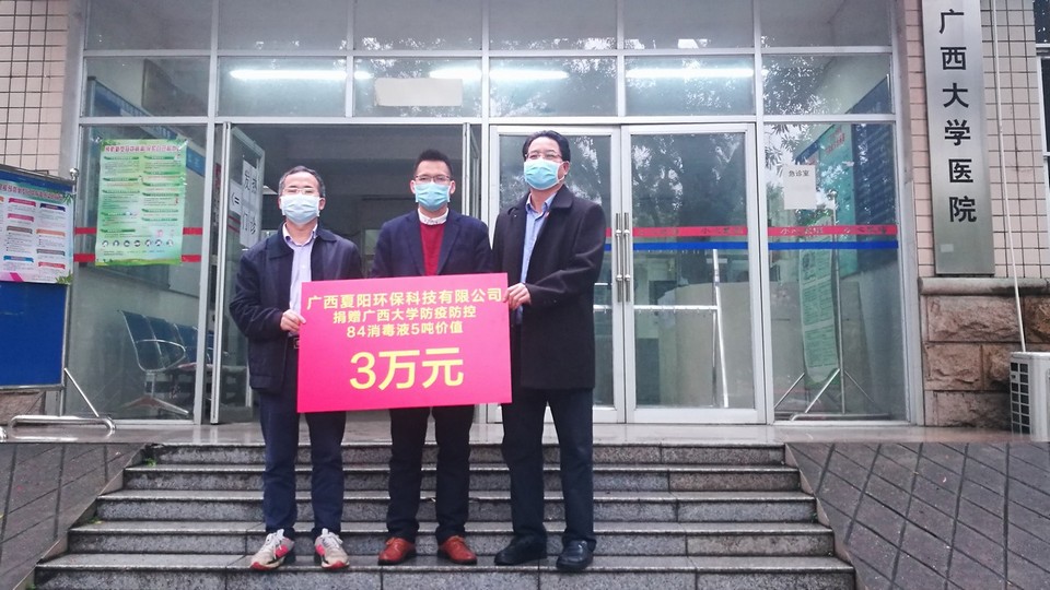 据悉,夏阳环保一直致力于环保治理方案的研究,助力生态文明建设,推动绿色发展。面对新型冠状病毒感染的肺炎疫情,夏阳环保用实际行动,践行自己的社会责任。自2月2日起,广西夏阳环保科技有限公司及其下属单位公司,陆续向我区部分市县和单位捐赠了价值300多万元的500多吨消毒剂。目前受赠的单位有河池市、来宾市、合山市、都安瑶族自治县、天峨县、象州县、武宣县、忻城县、金秀瑶族自治县、万象城(中国)等。(陈义群)